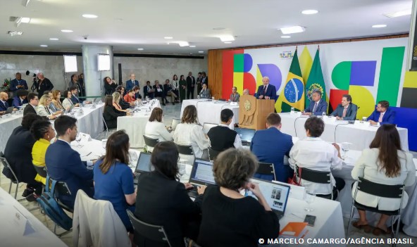 Na manhã desta quinta-feira, Lula recebeu jornalistas para um café da manhã, no Palácio do Planalto, seguido de coletiva de imprensa. Ele está acompanhado dos ministros da Fazenda, Fernando Haddad; da Casa Civil, Rui Costa; das Relações Exteriores, Mauro Vieira; e do Meio Ambiente e Mudança do Clima, Marina Silva.