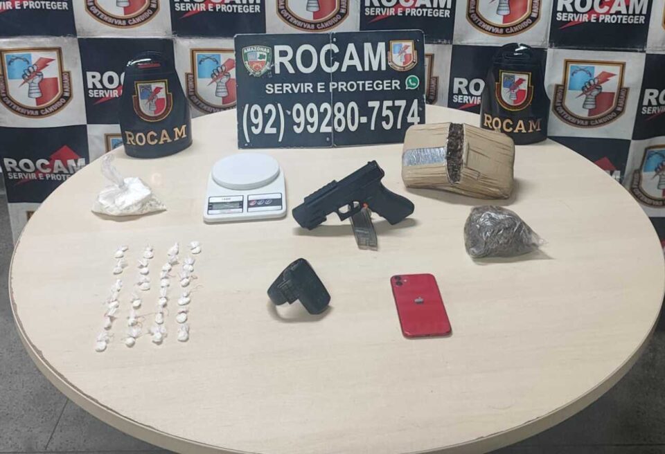 Policiais da Ronda Ostensiva Cândido Mariano (ROCAM) apreenderam drogas, uma balança de precisão, um simulacro de arma de fogo e uma tornozeleira eletrônica rompida durante uma ação no bairro Praça 14 de Janeiro, zona sul de Manaus. A ocorrência foi registrada na tarde desta sexta-feira (10/10), por volta das 17h30, após denúncia anônima recebida via WhatsApp da corporação.