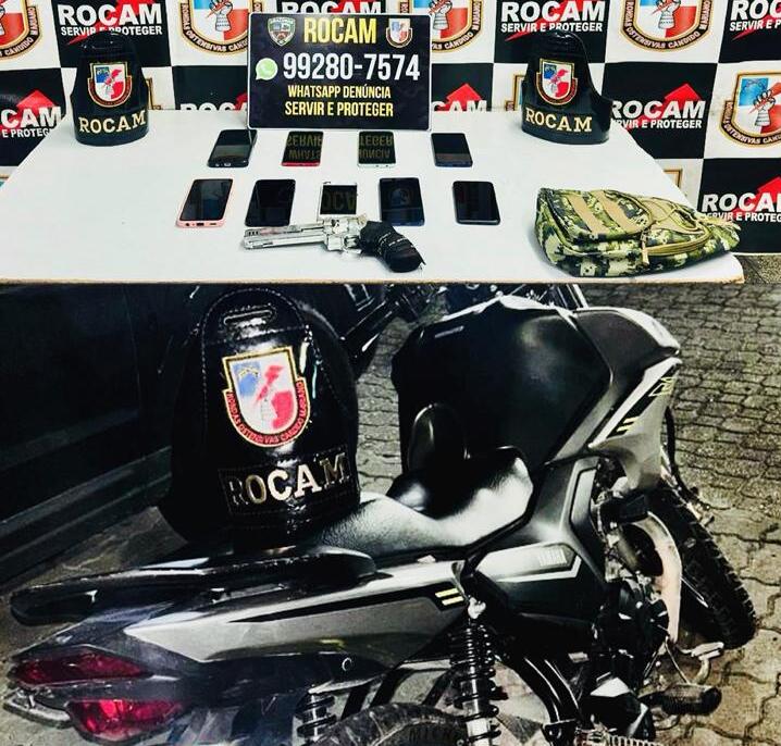 No imóvel, os policiais encontraram uma bolsa camuflada contendo nove aparelhos celulares, sendo um deles reconhecido pela vítima. Também foram apreendidos um simulacro de arma de fogo tipo revólver, dois capacetes e uma motocicleta Yamaha Factor, de cor prata. Os suspeitos, que possuem antecedentes criminais — um por roubo majorado e tentativa de homicídio e o outro por desobediência — foram conduzidos ao 6º Distrito Integrado de Polícia (DIP), juntamente com todo o material apreendido, para os procedimentos legais cabíveis.