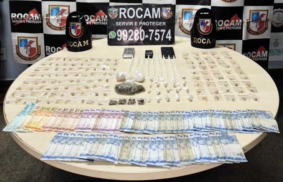 Ao chegarem ao local, as equipes ROCAM avistaram os dois suspeitos, que tentaram fugir, mas foram interceptados. Durante a revista pessoal, os policiais encontraram diversas porções de drogas e dinheiro. O material apreendido inclui 148 porções de oxi, 63 pinos de cocaína, cinco porções de maconha, duas balanças de precisão, um celular e R$ 502 em espécie.