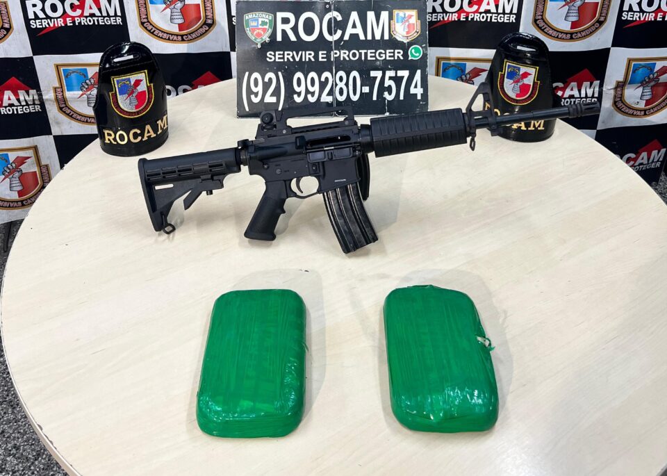 De acordo com a polícia, a equipe ROCAM, encontrou no interior da casa uma mochila contendo dois tabletes de substância entorpecente, possivelmente cocaína em pedra, além de um fuzil Taurus calibre 5.56 com dois carregadores. O suspeito, que já possuía antecedentes por tráfico de drogas e porte ilegal de arma de fogo, foi identificado no local e recebeu voz de prisão.